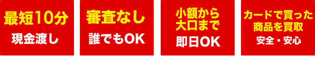 各種金券・チケット・貴金属(金・プラチナ)・携帯(iphone・ipad)・各種商品券・新幹線回数券・JR特急券・図書カード・各種ビール券・清酒券・お米券・クオカード・itunesカード・アマゾンカード・DMMカード・楽天カード等各種プリペイトカード・切手・収入印紙・テレホンカード・各種株主優待券・旅行券・お食事券・レジャー券、全国百貨店共通商品券、デパート商品券(三越・伊勢丹・高島屋・大丸・東武・西武・東急)信販ギフトカード(JCBギフト券、VJAギフト券、UCギフト券、ニコス)、丸井商品券、ルミネ商品券、パルコ、セブン&アイ商品券、イオン商品券、ダイエー商品券・マルエツ・東急ストア・ユニー商品券・ビッグカメラ商品券、ヨドバシカメラ商品券、旅行券(JTB旅行券・日本旅行・HIS旅行券・近畿日本ツーリスト・びゅう商品券JR東日本商品券・小田急トラベル・VISA・VJA旅行券・京王観光・農協観光・JALトラベル・ANAトラベル)、ビール共通券(各種額面)、清酒券、おこめ券、ジェフグルメ、ぐるなびギフトカード、クオカード(各種額面)、印紙(収入印紙・登記印紙)、切手(通常切手・記念切手)図書カード(各種額面)、図書券、携帯プリカ・テレカ・マクドナルド(バーガー券、ポテト券、ドリンク券)、各種航空優待券(JAL・ANA株主優待券)、JR東日本、東海、西日本優待券、私鉄優待券(京成・京王・西武・東武・小田急・東急・京浜急行)、各種飲食優待券(松屋・吉野家・王将・大庄・ワタミ・第一興商株主優待券・ゼンショー株主優待券・リンガーハット食事券・シダックス・梅の花・COCO壱番・サイゼリア)、各種レジャー優待券(ディズニー株主優待券・東京サマーランド株主ご招待券綴・サンリオピューロランド・よみうりランド・富士急ハイランド・)東宝シネマズ映画鑑賞券、イオンシネマ (ワーナーマイカル) 映画鑑賞券、MOVIX 映画鑑賞券(全国共通)、大江戸温泉物語、極楽湯、美ら海水族館入場券、横浜八景島シーパラダイス、新江ノ島水族館、八景島シーパラダイス、JR新幹線回数券(東海道山陽新幹線・東北・山形・秋田新幹線・上越・長野新幹線・特急あずさ回数券)